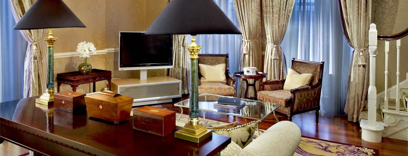 The College Suite is one of the finest Presidential Suites in Ireland. Covering two floors over 1,787 square feet (166 square metres), with its own balconies overlooking the city's famous landmarks of Trinity College Dublin, College Green and the landmark old Bank of Ireland, this is truly a wonderful suite. The lower level includes a spacious living room, a full dining room, a bedroom with a king-sized bed, dressing area, and a large luxurious en-suite bathroom with a Jacuzzi bath. The upper level features an office/library, private exercise area, and a Nordic steam room.